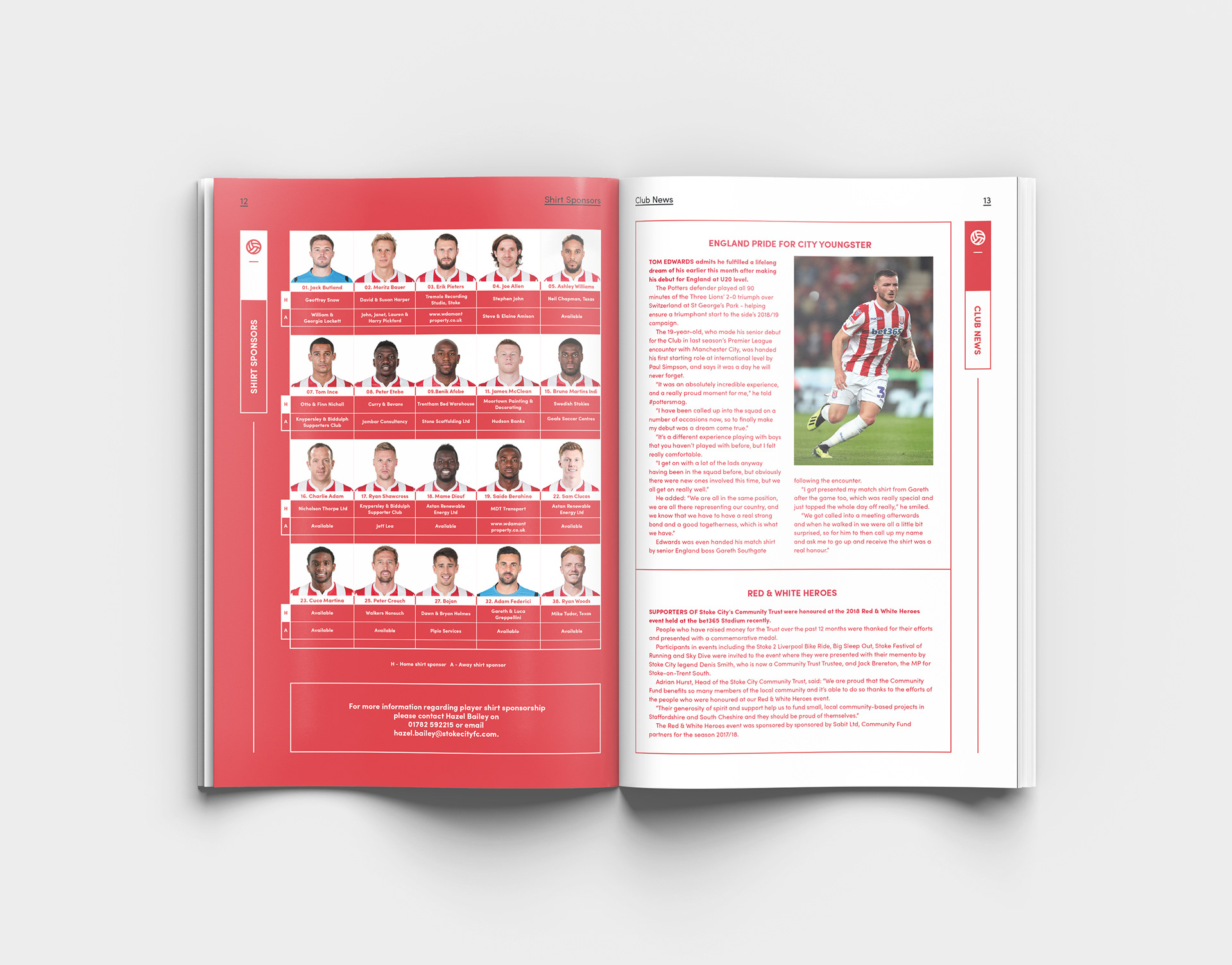 The Official Stoke City Matchday Magazine for the 2018/19 season in the Championship. Published in collaboration with Reach Sport. This season's edition of #Pottersmag took a drastically different approach from previous seasons, we decided to adopt a stylised photographical approach for the cover and stripped back all the elements to give the publication a more lifestyle feel. We also created a branded masthead for the cover which will be used for all future #pottersmag magazines. A key part of this redesign was taking a clean, minimal approach to all spreads featured inside. Dimensions: 165mm (W) x 240mm (H)