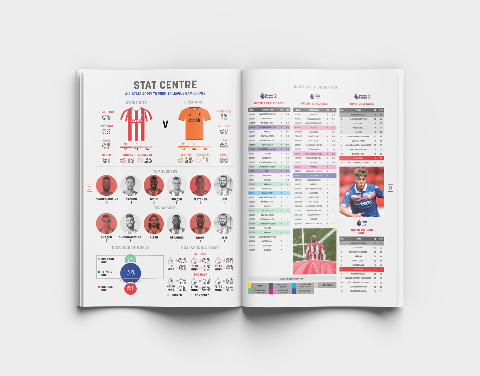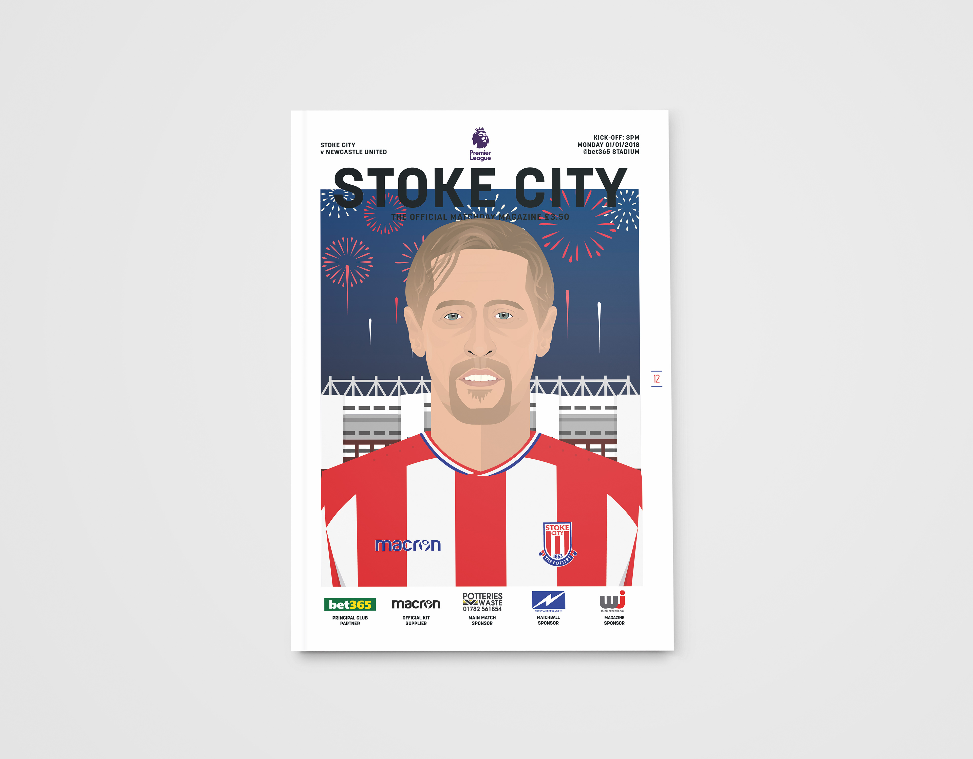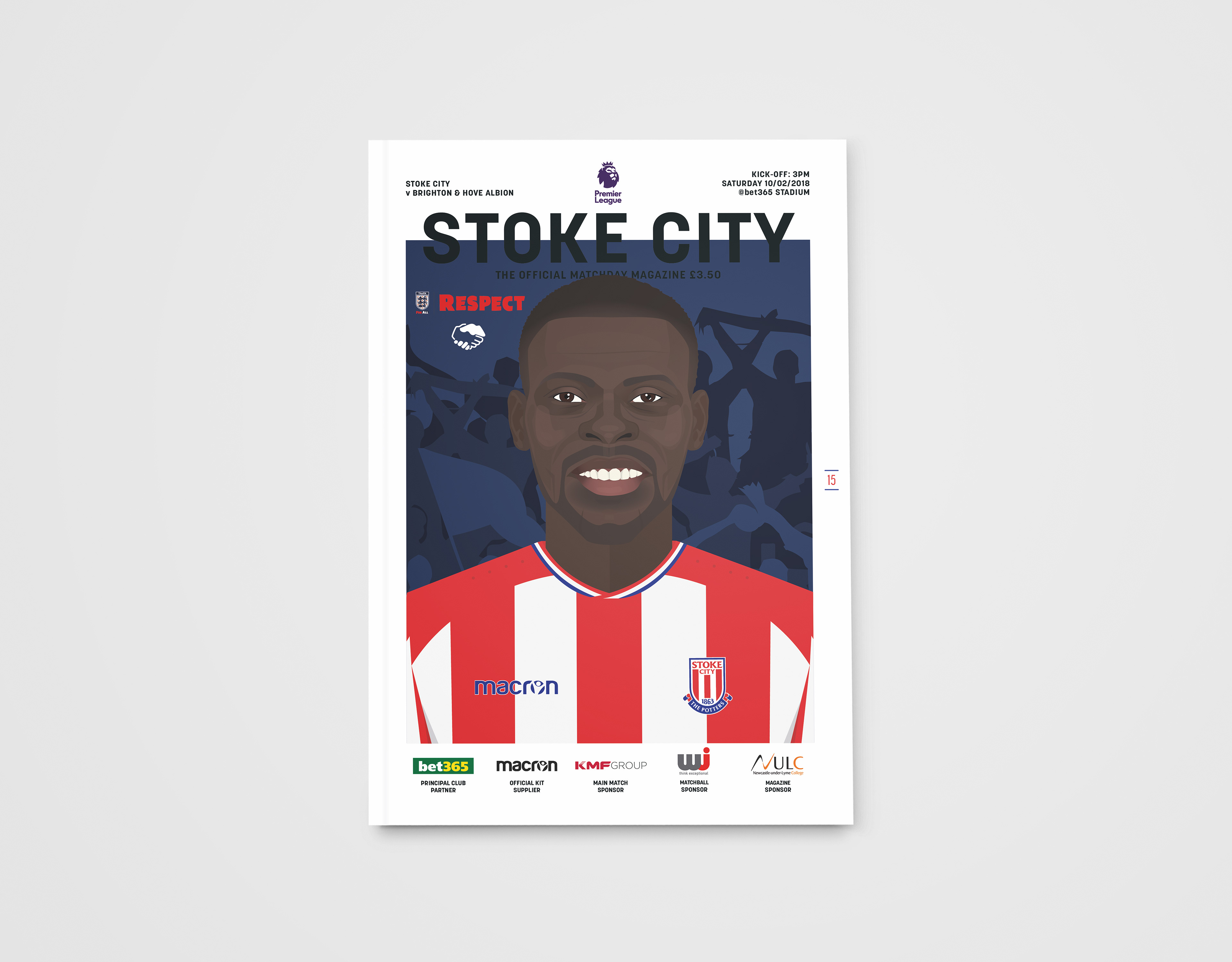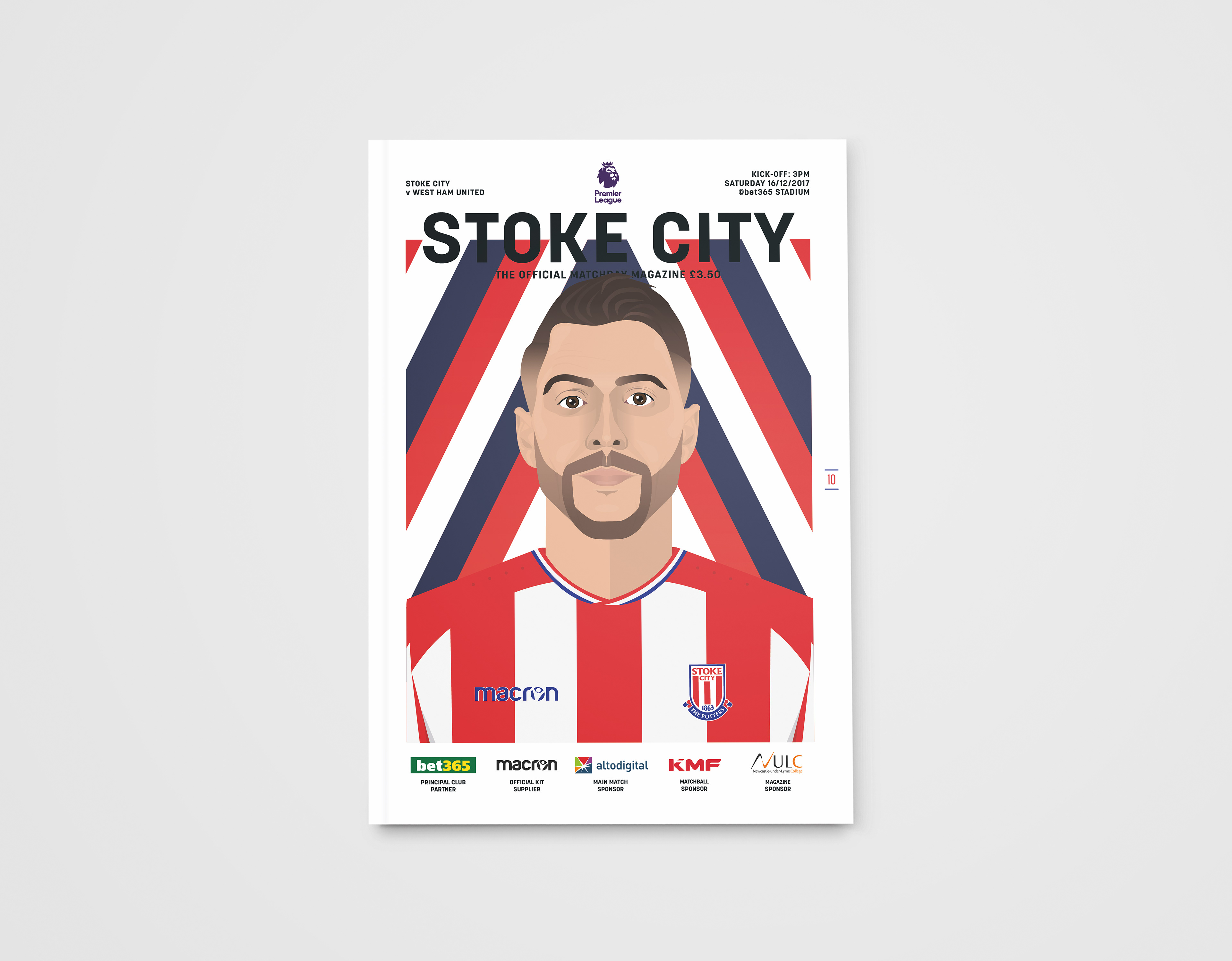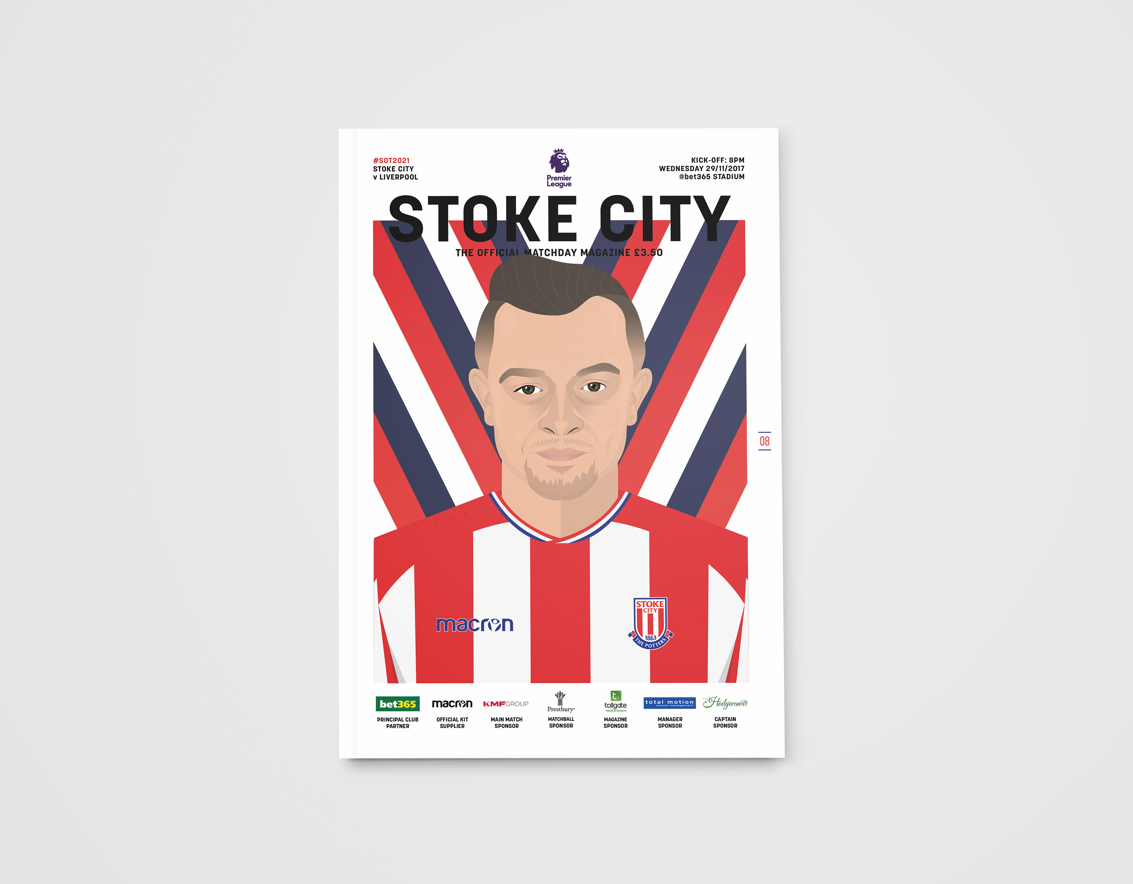 The Official Stoke City Matchday Magazine for the 2017/18 season in the Premier League. Published in collaboration with Trinity Mirror Sport Media (now Reach Sport). This season's edition of #Pottersmag was heavily designed around vector based illustrations used on the cover and throughout the Magazine. The cover illustrations were heavily influenced by work from Stanley Chow and David Flanagan. Each cover for the season features a headshot illustration of a different player. Dimensions: 165mm (W) x 240mm (H) Featured on: Soccerbible